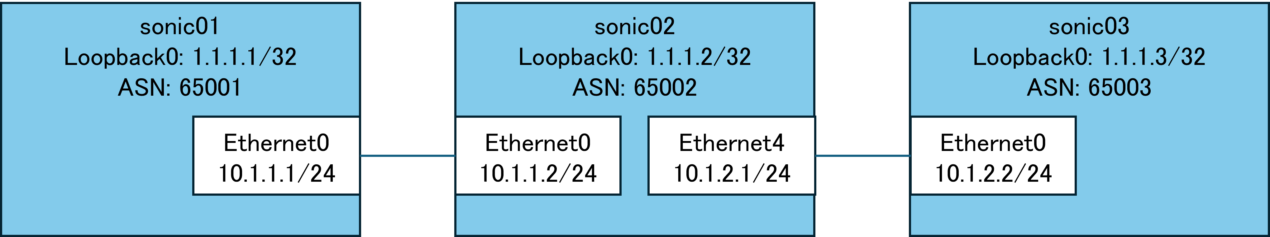 sonic01# show ip route Codes: K - kernel route, C - connected, L - local, S - static, R - RIP, O - OSPF, I - IS-IS, B - BGP, E - EIGRP, N - NHRP, T - Table, v - VNC, V - VNC-Direct, A - Babel, F - PBR, f - OpenFabric, t - Table-Direct, > - selected route, * - FIB route, q - queued, r - rejected, b - backup t - trapped, o - offload failure C>* 1.1.1.1/32 is directly connected, Loopback0, 00:01:33 B>* 1.1.1.2/32 [20/0] via 10.1.1.2, Ethernet0, weight 1, 00:00:48 B>* 1.1.1.3/32 [20/0] via 10.1.1.2, Ethernet0, weight 1, 00:00:21 C>* 10.1.1.0/24 is directly connected, Ethernet0, 00:01:05試しに、sonic01からsonic03のLoobackインタフェースのIPアドレスの"1.1.1.3"に対してpingを実行すると、以下のように成功しました。