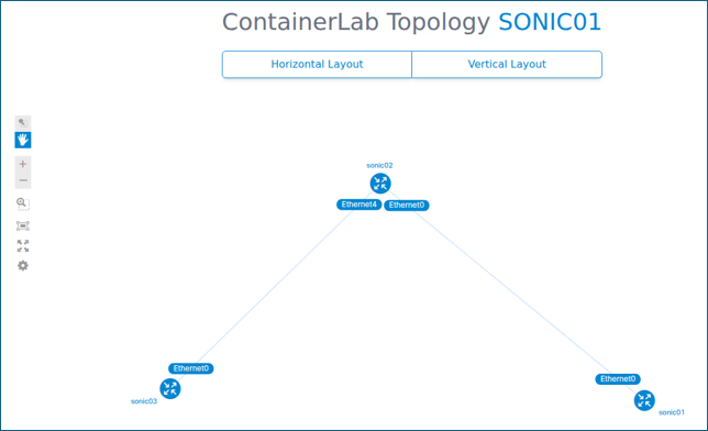 上記のテスト環境を構築するために、以下を記述した sonic.yml ファイルを用意します。name: sonic01 topology: nodes: sonic01: kind: sonic-vs image: docker-sonic-vs:latest sonic02: kind: sonic-vs image: docker-sonic-vs:latest sonic03: kind: sonic-vs image: docker-sonic-vs:latest links: - endpoints: ["sonic01:Ethernet0", "sonic02:Ethernet0"] - endpoints: ["sonic02:Ethernet4", "sonic03:Ethernet0"]上記の"node"の部分で、dockerに登録したSONiCイメージを"docker-sonic-vs:latest"として指定しています。また、リンク接続の定義の中で、endpointsには、SONiC内部にて認識するインタフェース名のEthernet0とEthernet4を指定しています。このsonic.ymlファイルと実行バイナリファイルのcontainerlabを同一ディレクトリに置きます。まず以下のコマンドにてトポロジーを表示させてみます。